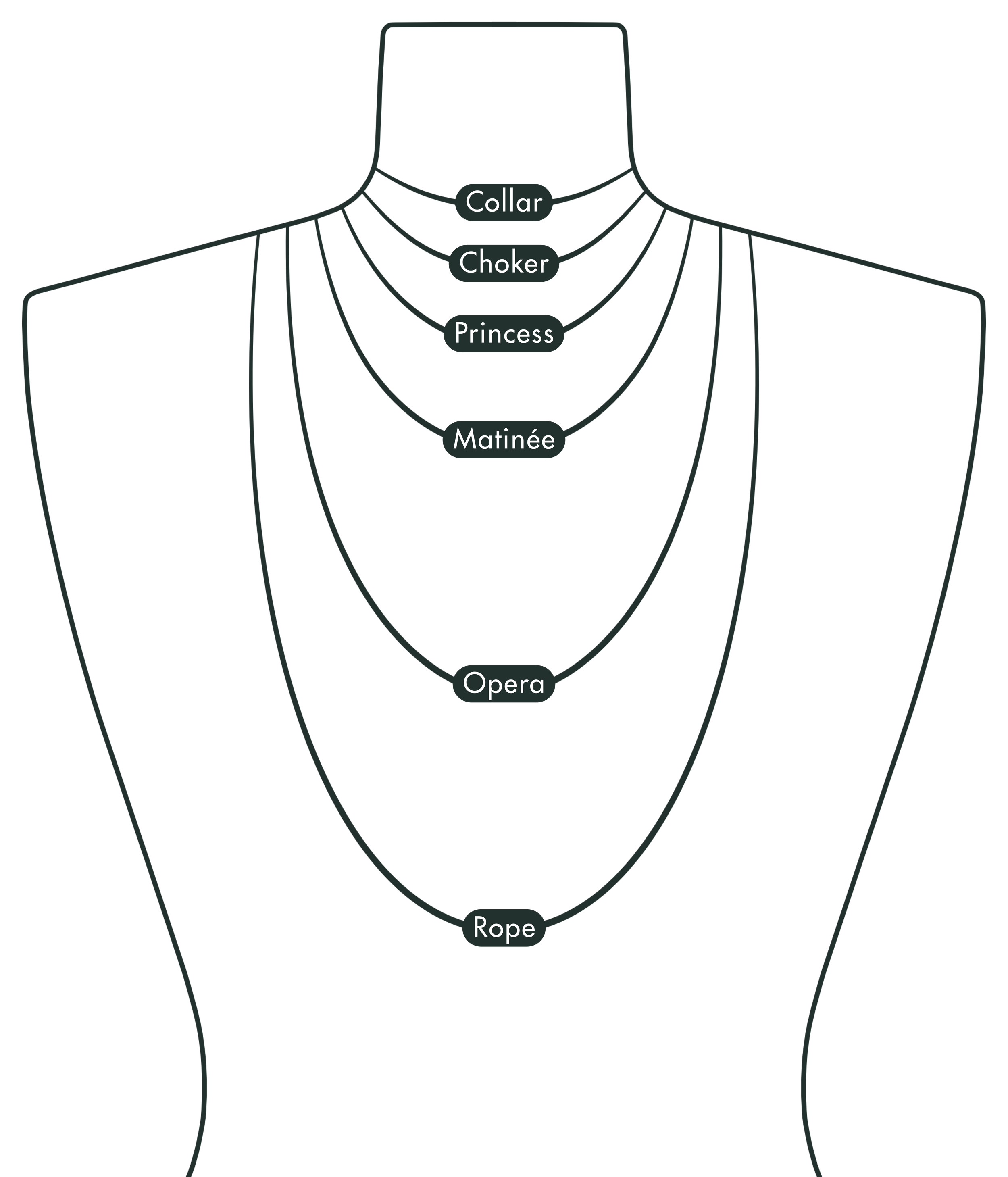 Necklaces are often sold in standardized size styles. From shortest to longest, these styles are: Collar, Choker, Princess, Matinée, Opera, and Rope.